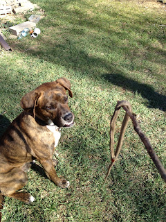 FORTUNATELY, our wonderful young dog has matured over the winter and has developed into an incredible snake catcher. The first one he caught this spring he killed swiftly. I think that was a fluke. He has since caught five or six more and after letting him play with the second one for a few minutes and realizing he had no idea what to do, I managed to call him off it and put the stunned thing in a box. Our pup, Bishop, and I now have a pretty great partnership. When we spot one, he pops on it. He's very fast and catches them easily. The snakes go into a stun mode where they don't move. I use two long handles from an old hoe and an old shovel to pick the snake up, chop-stick style, and drop it in a big box with a lid. After that, when my husband gets home and can watch the children, I ferry the snake down the road and release it near the creek that is part of an open space. It's win-win-win. The dog has a great job where he shines. The snake gets to live and we reduce our population! We are making great headway. This snake today was the first I'd seen in three weeks, which is much better than a daily occurrence!